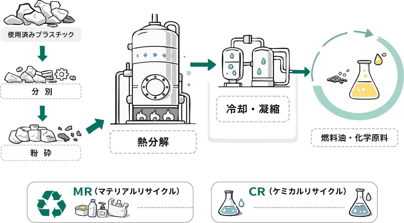 廃プラスチックを熱分解し、燃料油や化学原料として再利⽤するリサイクル技術。